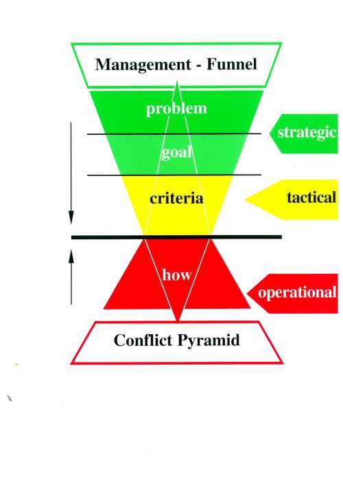There are two contradicting pyramids. The “management funnel” and the “conflict pyramid’. Both cover to three stages (strategic, tactical and operational). On the strategic level (problem and goal) the chances of conflict are small, but if you have a conflict it runs deep! On a tactical level (criteria) the chances of conflict are increasing but on a operational level the chances on a conflict are the biggest. Therefore Filip concludes the following: A manager should be authoritarian on the strategic and tactical level. But on an operational level manager should accept any solution that meets his criteria. In other words keep away from the ‘how’.