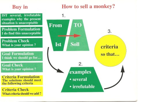 Of course there’s more to it, a shared vision is a prerequisite and the person(s) who will create the solution must acknowledge the problem. Pilip has a very simple strategy for that, he calls it ‘how to sell a monkey’. If you have a problem as a manager, then the monkey is ‘on your shoulder’. You need to get the monkey on the shoulder of your coworker. Just take the following steps: