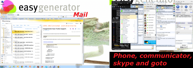 I have a laptop with a docking station and an external screen. On the left site you see my main screen, with the mail open. I use this screen to work in. The right site is my laptop screen, I have my communication programs on that screen. My phone (if you call my office number in Rotterdam you will get my laptop), communicator for in-company communication, Skype and Goto Meeting for external communication. I can call, mail, and talk to everyone all over the world. Goto allows me to do webinars and demo’s to groups of people.
