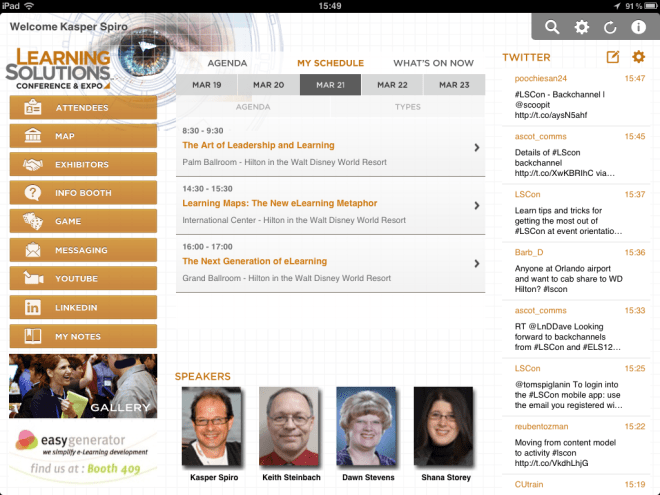 Tomorrow is the start of the Learning Solution conference, but for me it started today. The Ipad/Iphone app is now available and that is a great way to start the conference. You can easily browse through all the session, see the presentations and add them to your schedule with one click. I love it.
