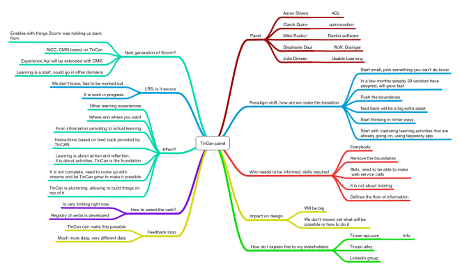 I attended the panel discussion on TinCan this morning; great session. I have tried to capture the session in a mind map. It is clear that TinCan is a major change. It is not only a shift from tracking and tracing to enabling learning experiences, it opens op a whole new world of possibilities. We have to redefine what (e)Learning is or could be. Some remarks at the panel triggered me into this observation: