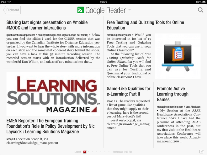 There is another tool like it; Zite. Zite will show you information based on keywords you give in. It also has a magazine like interface and the advantage is that you will get information from outside your standard network. I also use aggregation sites, they will select information for you and inform you on a daily or weekly basis on interesting posts. ELearninglearning is the one I use most intense, but there are more like ‘Working smarter Daily‘.
