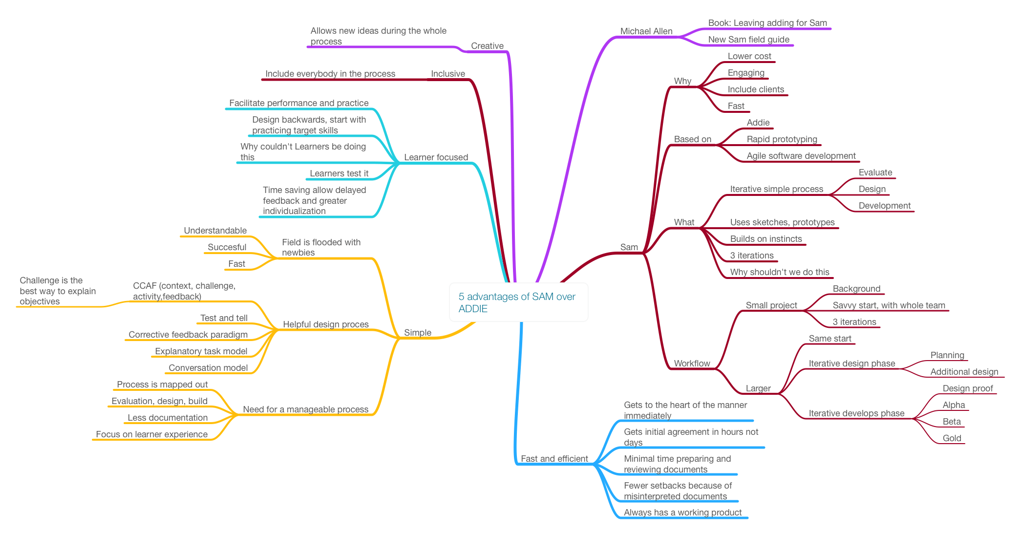 A session by Michael Allen on SAM. If you read this blog regularly you know I’m a fan of Michael and of agile development. (see my series of post on the topic).Michael only covered three of the 5 advantages during the session, because he had to first explain the basic principles of SAM. But he is so knowledgeable and experienced that you always learn something new. See the mind map for details.