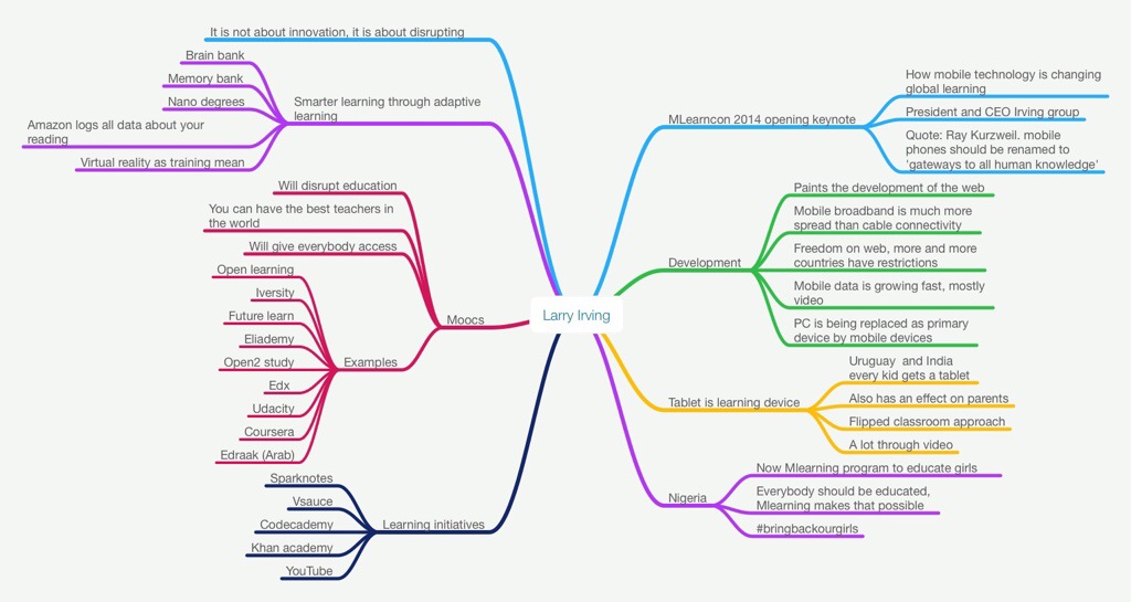 The opening keynote by Larry Irving started out a bit dull for me. He took us along all the impressive numbers of the growth of the web and mobile. What I liked most is his conviction that everybody has a right on education and that Mobile learning will make this possible. He gave examples on changes and developments in education. What I liked most was his end: Education does not need innovation, it needs disruption. I tried to capture his talk in the mind map.