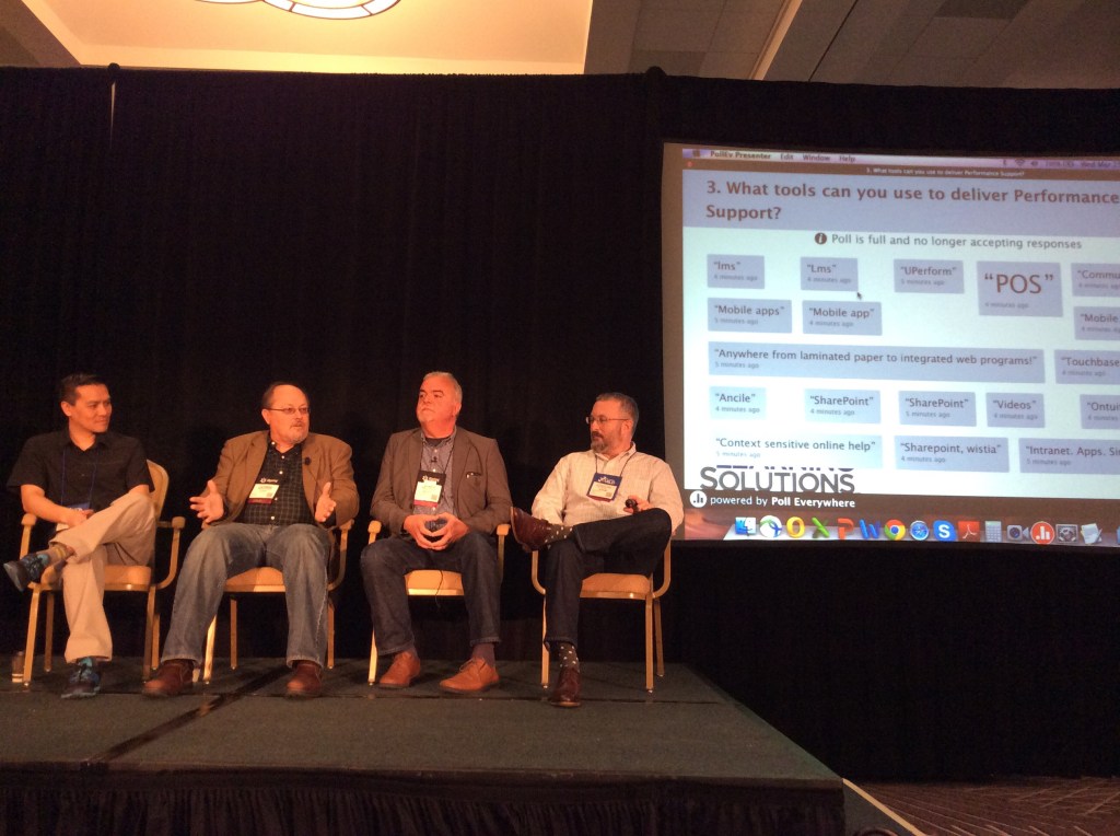 Panel about performance support. They were in agreement most of the time. it is about changing behavior, in the workplace, by using context and without interfering in the work. Here is my .